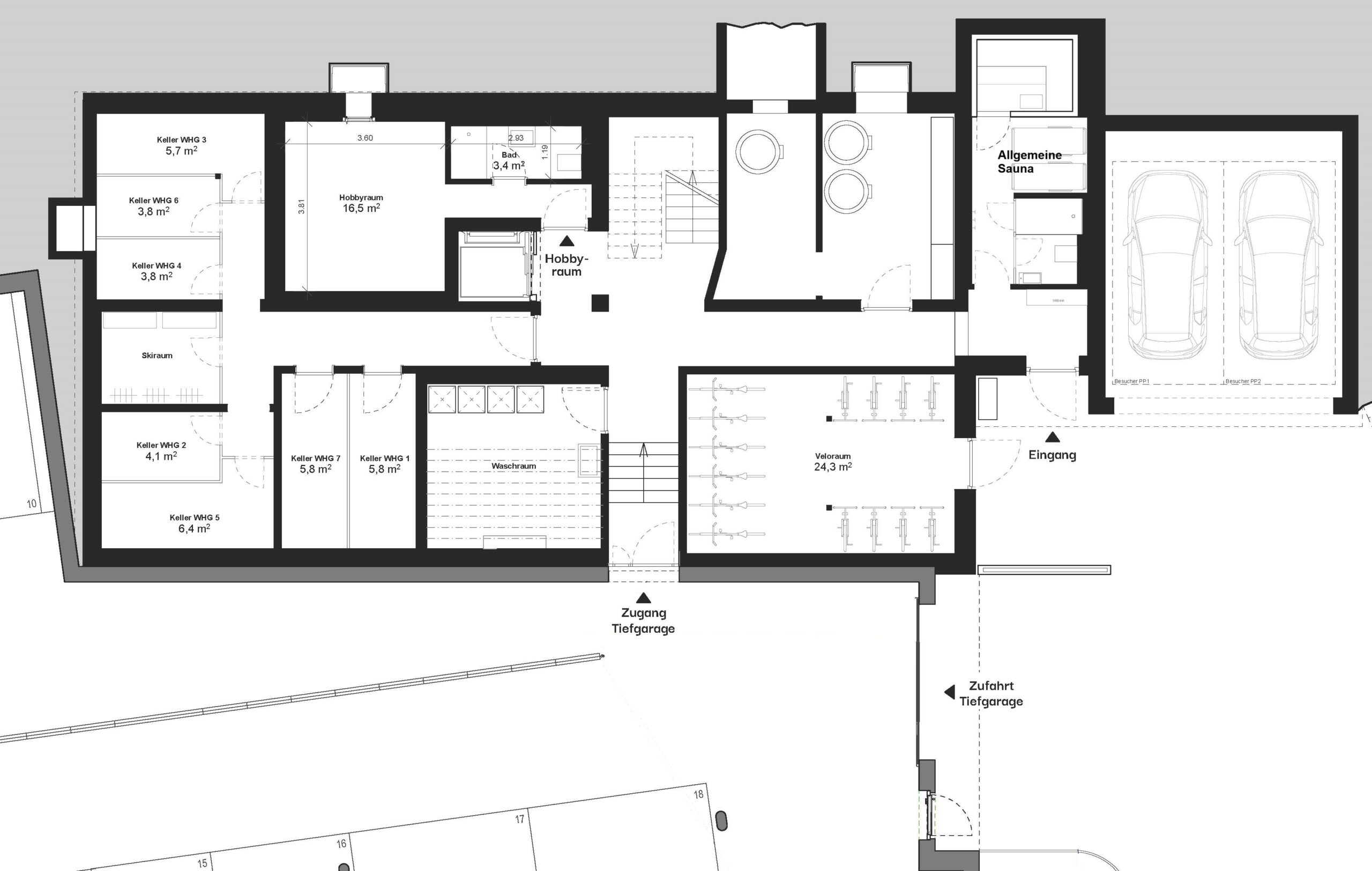 Nachhaltigkeit und zukunftsweisende Energielösungen Ein zentrales Anliegen dieses Projekts ist der verantwortungsvolle Umgang mit Ressourcen. Das nachhaltige Energiekonzept kombiniert eine leistungsstarke Wärmepumpe, Erdsonden und eine eigene Photovoltaikanlage. Dies sichert eine effiziente, umweltfreundliche Energieversorgung und ermöglicht komfortables Wohnen mit minimalem ökologischen Fussabdruck. Die mit dem Haus verbundene Tiefgarage bietet zudem sichere Stellplätze mit Elektroladevorbereitung und komfortablen Zugang zu den Wohnungen – auch im Winter ein echtes Plus. Im Veloraum steht gibt es genügend Steckdosen um Ihre E-Bikes aufzuladen.