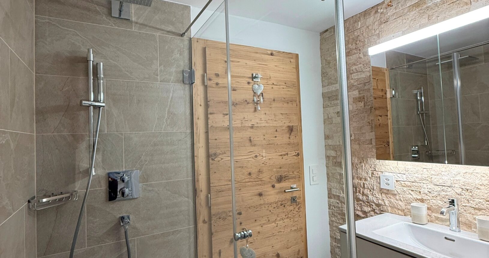 Die Nasszelle verfügt über eine Walk-in Regendusche und ist hell gestaltet. Die Wohnung hat ein grosszügiges Doppelschlafzimmer mit toller Aussicht.
