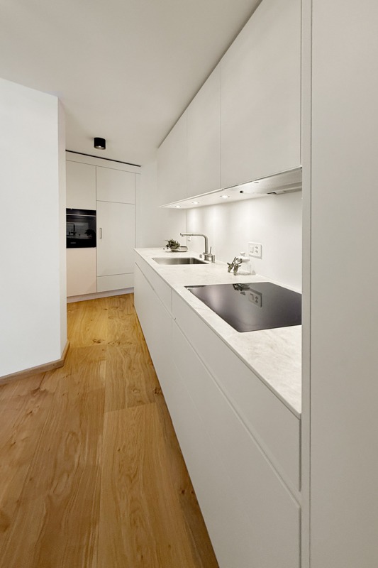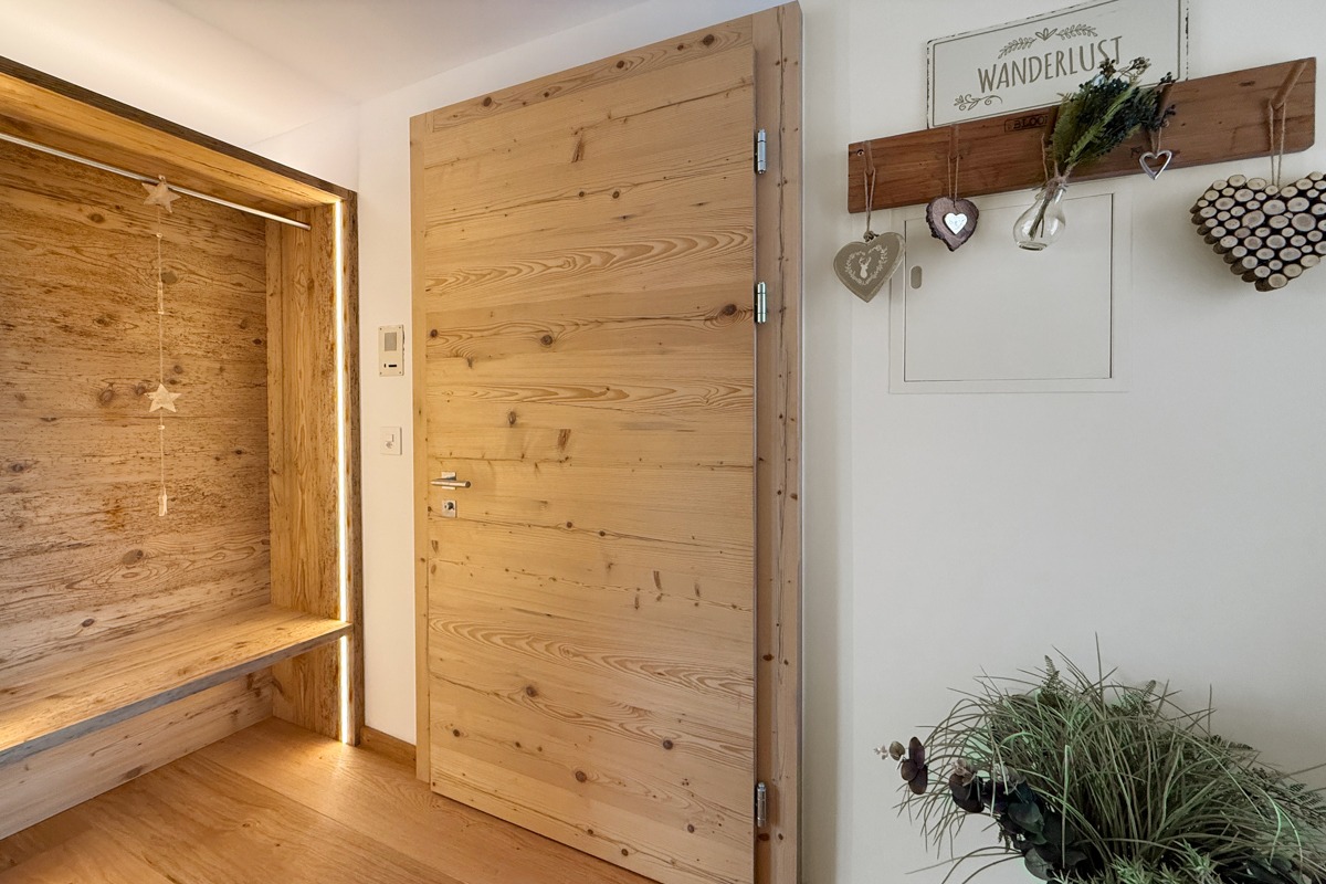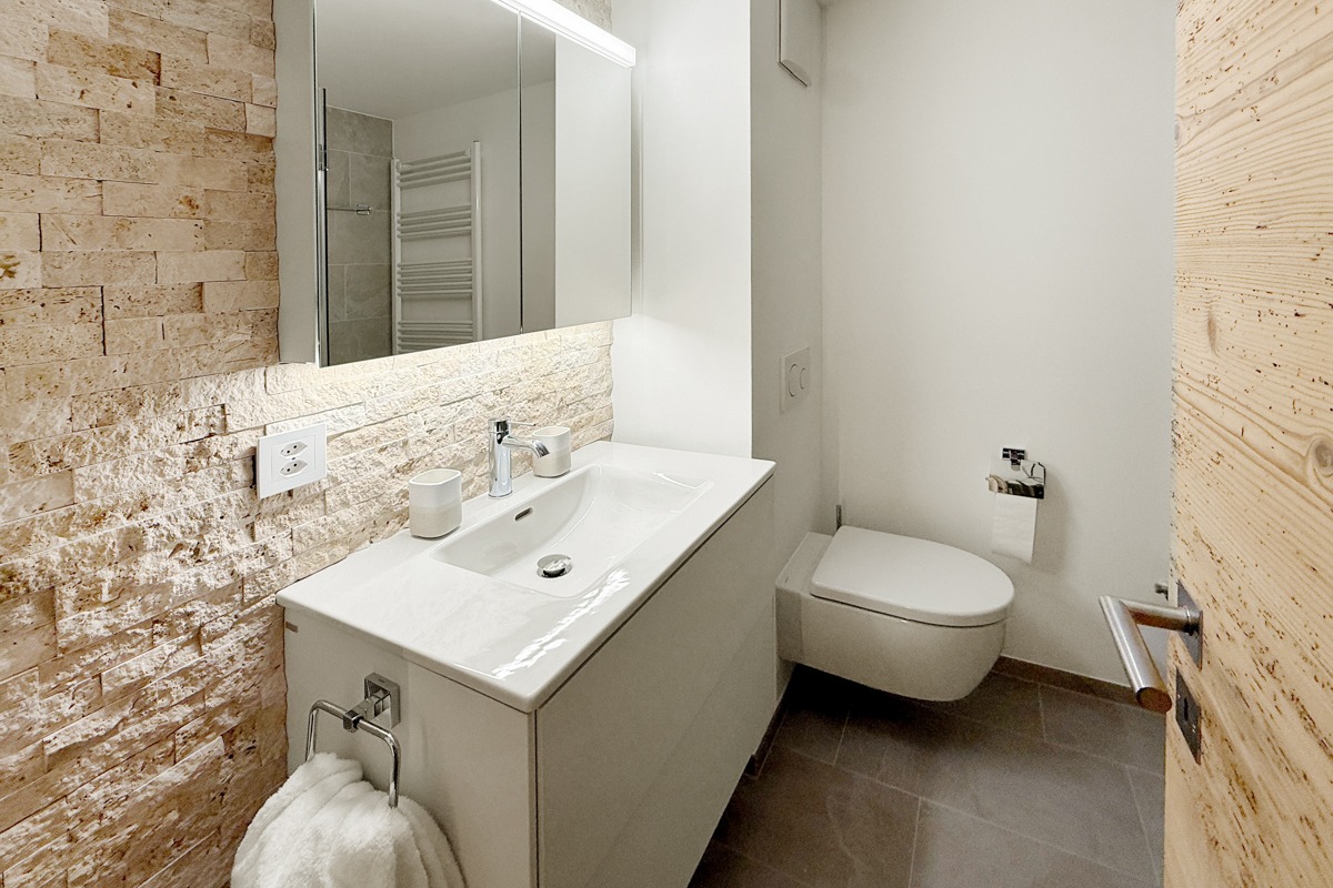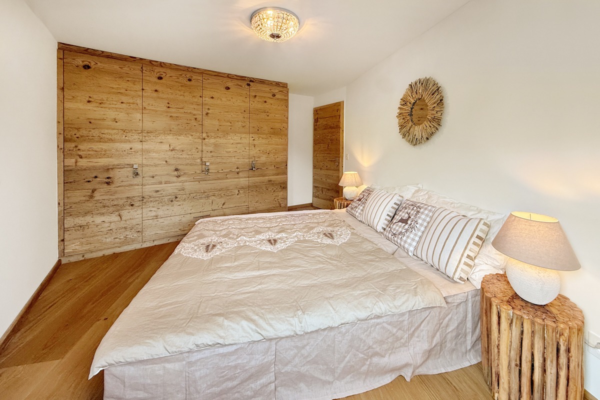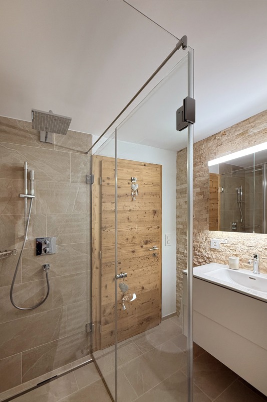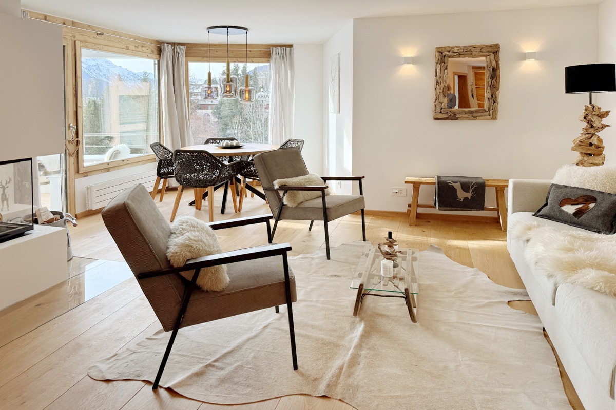 Die Wohnung wurde diesen Herbst im modern-rustikalen Alpenstil renoviert. Dabei wurden alle Fenster, Radiatoren, Wasser- und Elektroleitungen ersetzt und ein neues Raumkonzept mit einer weissen Küche und Schränken und Türen aus Altholz gestaltet. Der Boden wurde mit einem breitriemigen Eichen-Parkett versehen.
