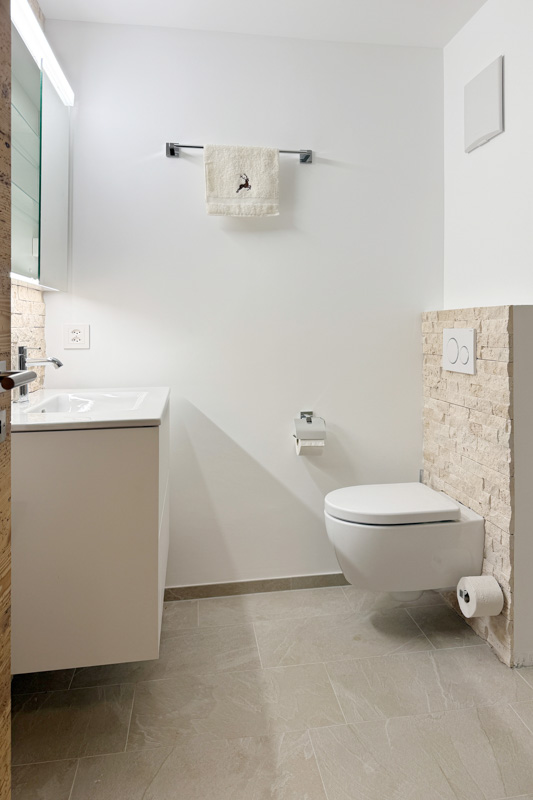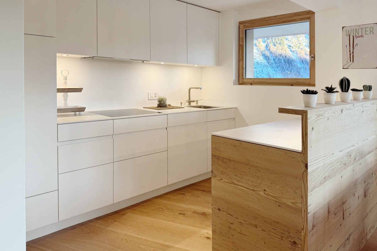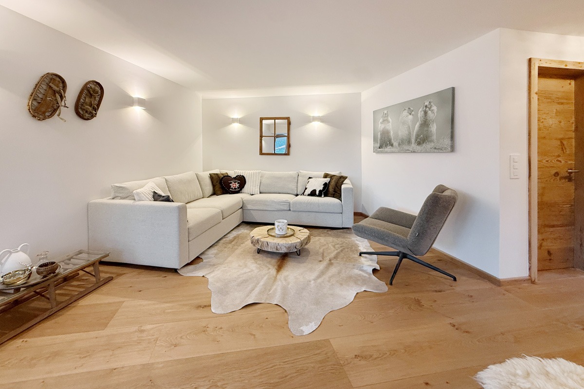 Die Wohnung wurde diesen Herbst im modern-rustikalen Alpenstil renoviert. Dabei wurden alle Fenster, Radiatoren, Wasser- und Elektroleitungen ersetzt und ein neues Raumkonzept mit einer weissen Küche und Schränken und Türen aus Altholz gestaltet. Der Boden wurde mit einem breitriemigen Eichen-Parkett versehen.