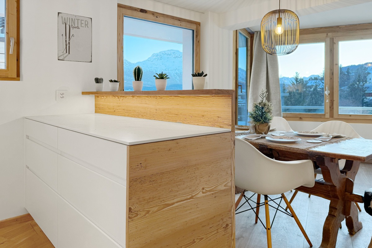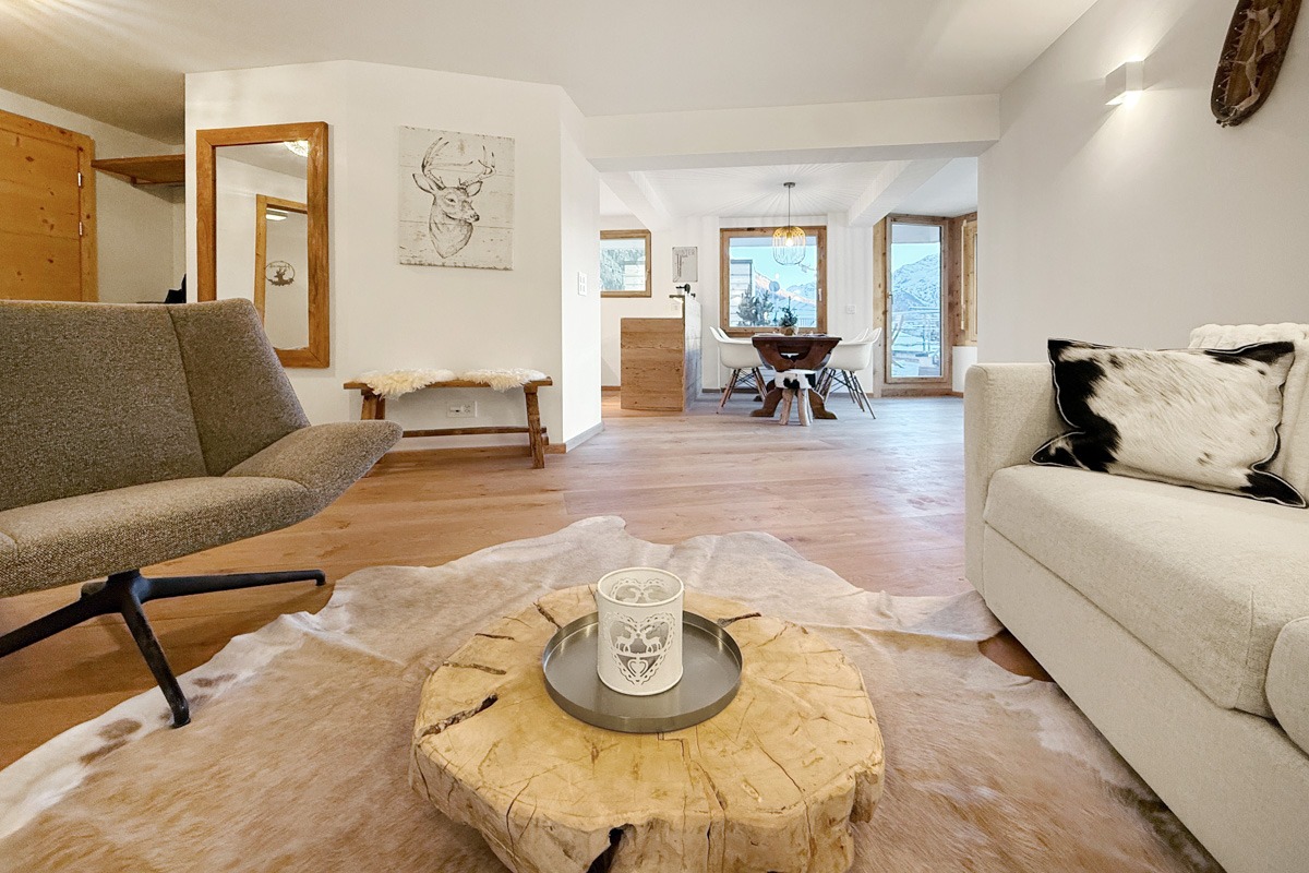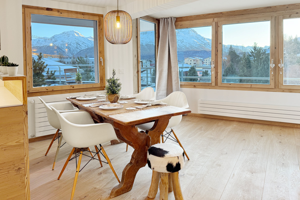 Suchen Sie eine zentral gelegene und dennoch sehr ruhige Dachwohnung? Hat ganztägige Besonnung und spektakuläre Aussicht auf die Berninagruppe erste Priorität? Dann könnte diese hochwertig umgebaute 3.5 Zi-Ferienwohnung mit Eleganz und Raffinesse das Richtige für Sie sein.
