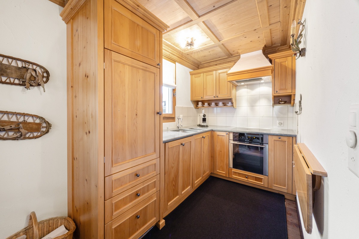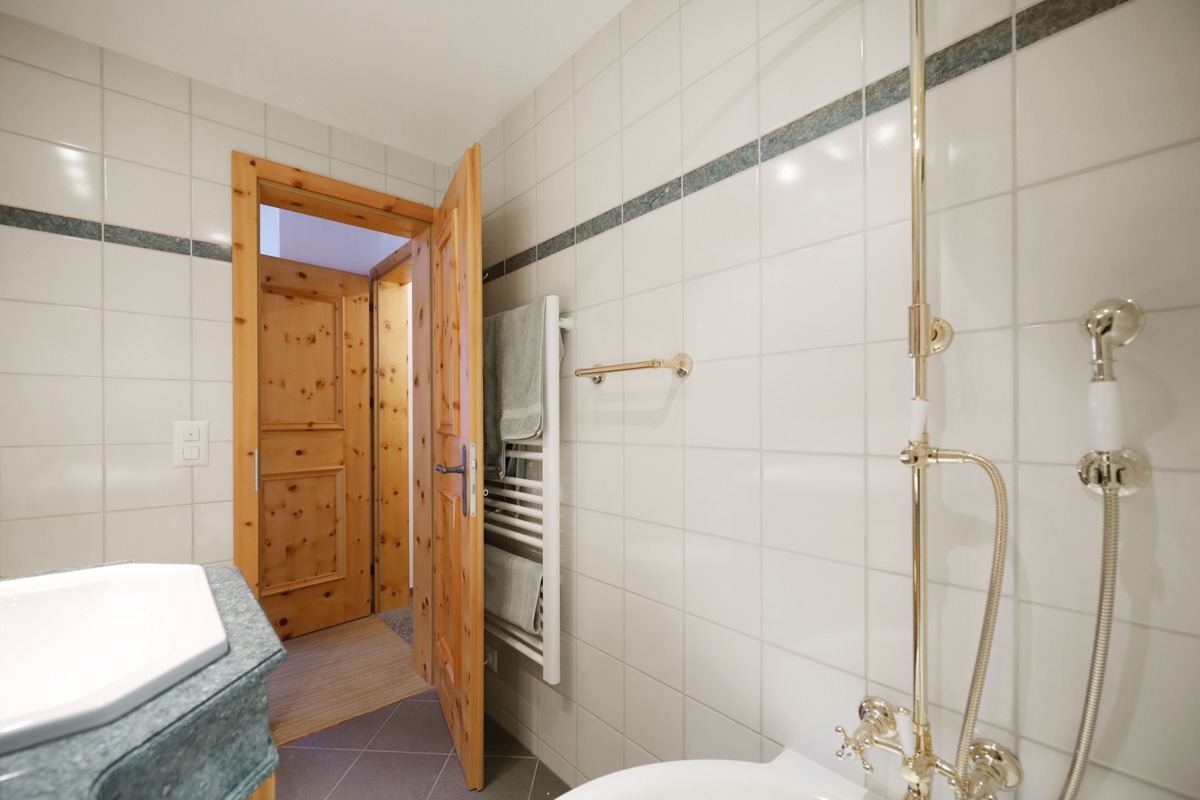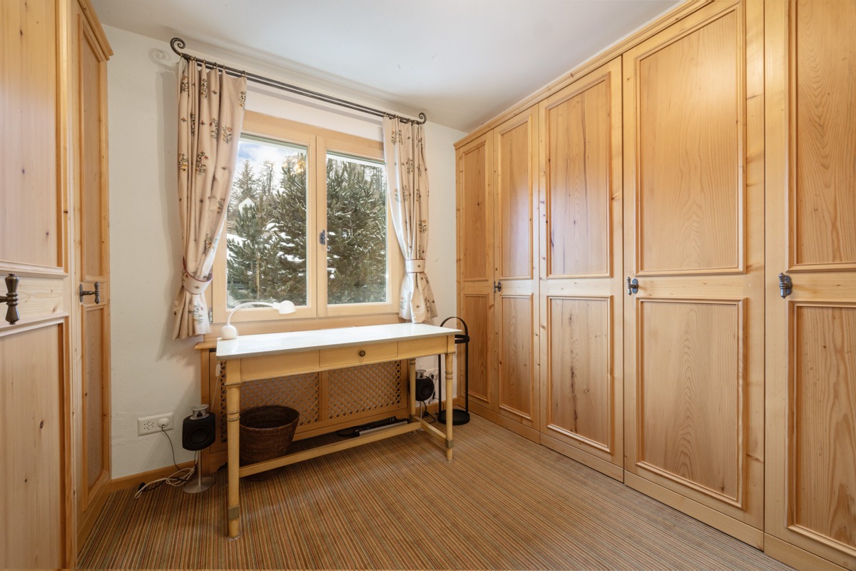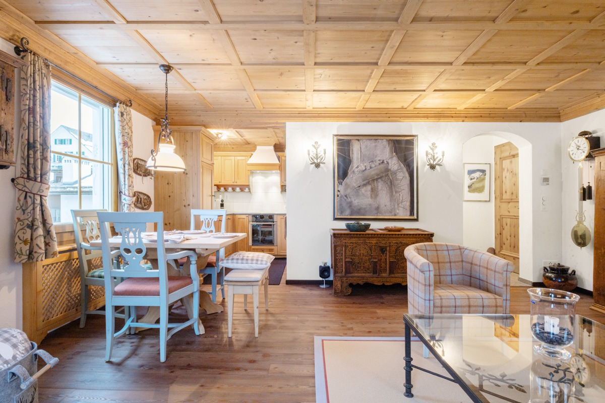 Das Wohnzimmer besticht mit einer Kassettendecke aus Arvenholz sowie einem stilvollen Kamin. Das TV-Gerät ist unauffällig hinter einem Gemälde eingebaut. Es sind sehr viele Einbauschränke vorhanden. Im Schrank des zweiten Schlafzimmers sind bereits Massnahmen getroffen, um ein Klappbett einbauen zu können. Die beiden Nasszellen sind stylisch und hochwertig ausgestattet.