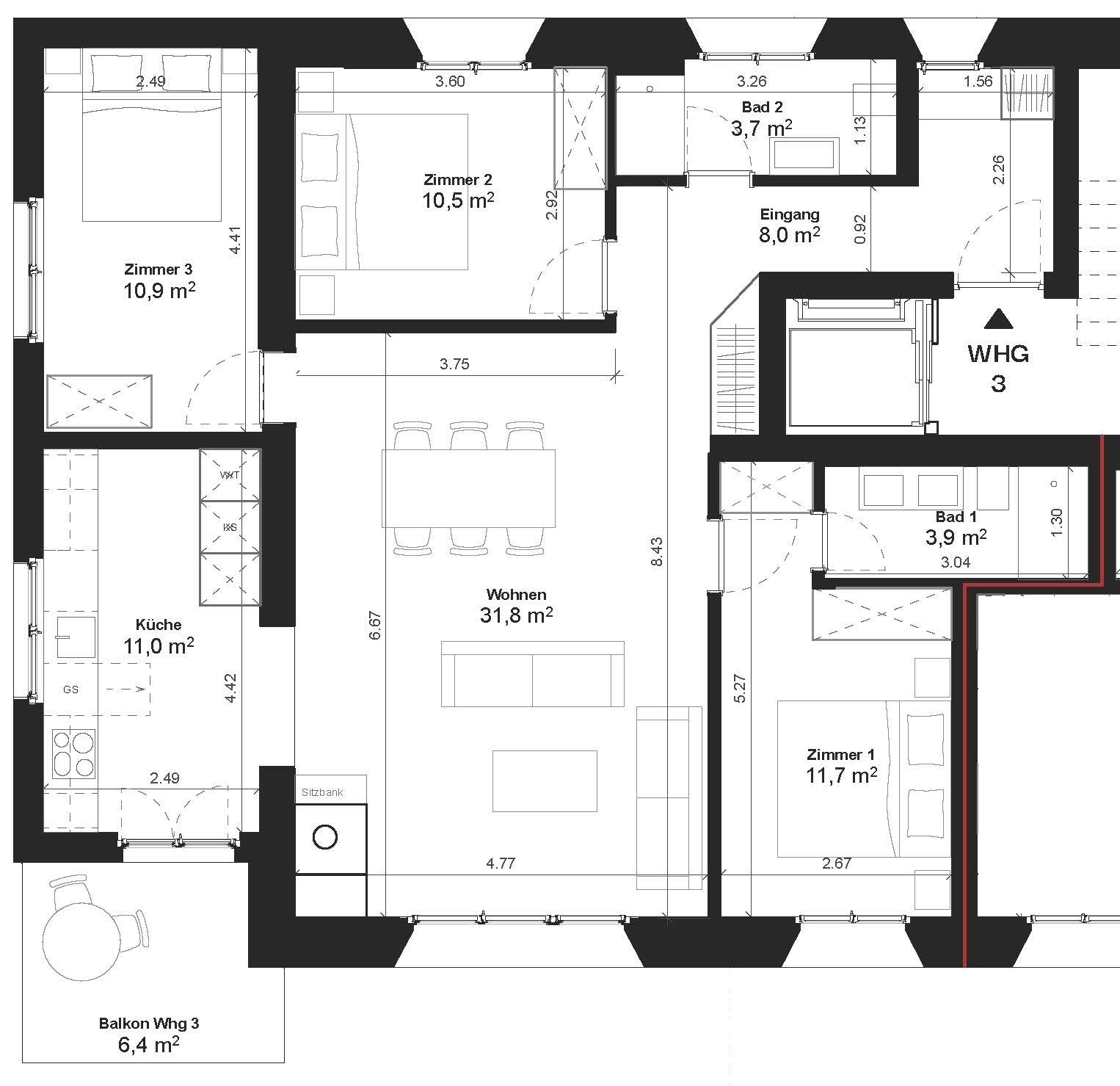 Das Haus umfasst insgesamt sieben grosszügige Zweitwohnungen. Die Grundrisse orientieren sich an zeitgemässen Wohnbedürfnissen. Jede Einheit überzeugt durch ihre klare und durchdachte Raumaufteilung, offene Wohn- und Essbereiche sowie gut dimensionierte Schlafzimmer und flexible Nutzungsmöglichkeiten.
