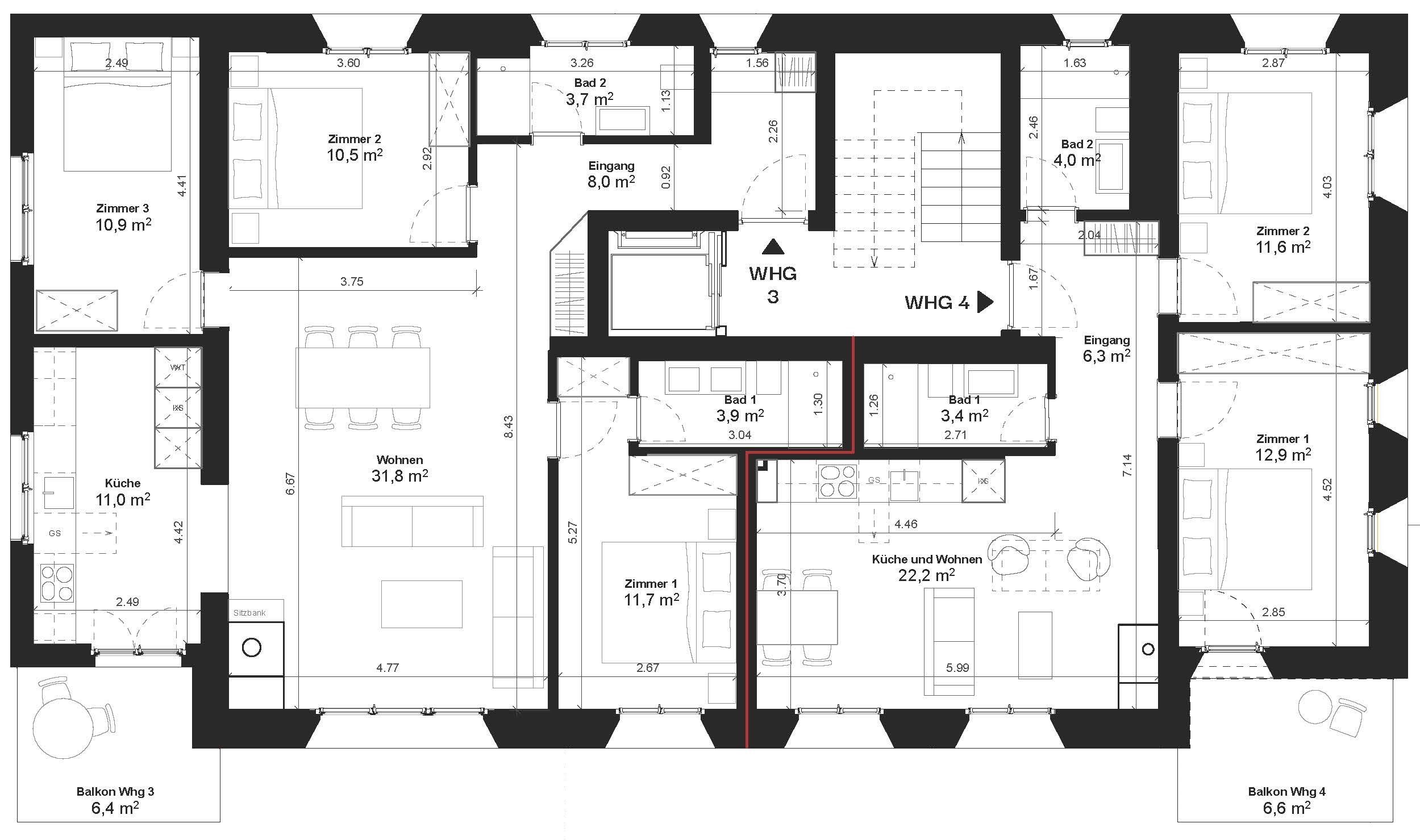 Das Haus umfasst insgesamt sieben grosszügige Zweitwohnungen. Die Grundrisse orientieren sich an zeitgemässen Wohnbedürfnissen. Jede Einheit überzeugt durch ihre klare und durchdachte Raumaufteilung, offene Wohn- und Essbereiche sowie gut dimensionierte Schlafzimmer und flexible Nutzungsmöglichkeiten.