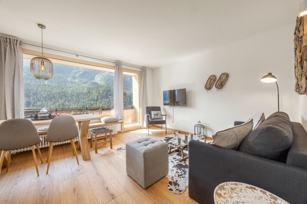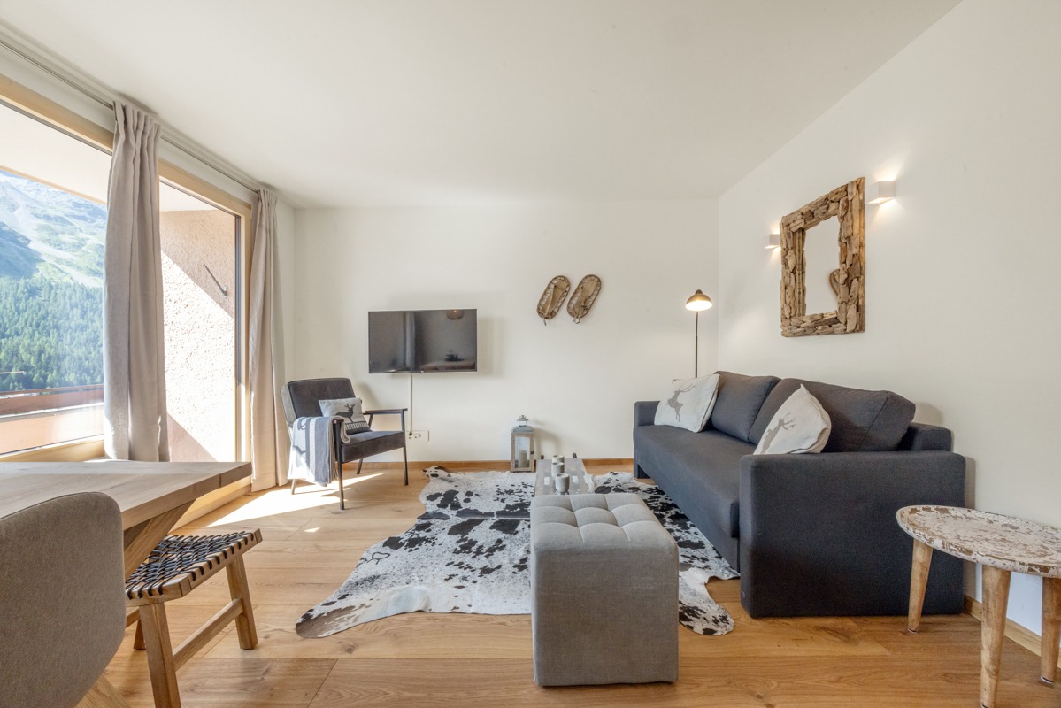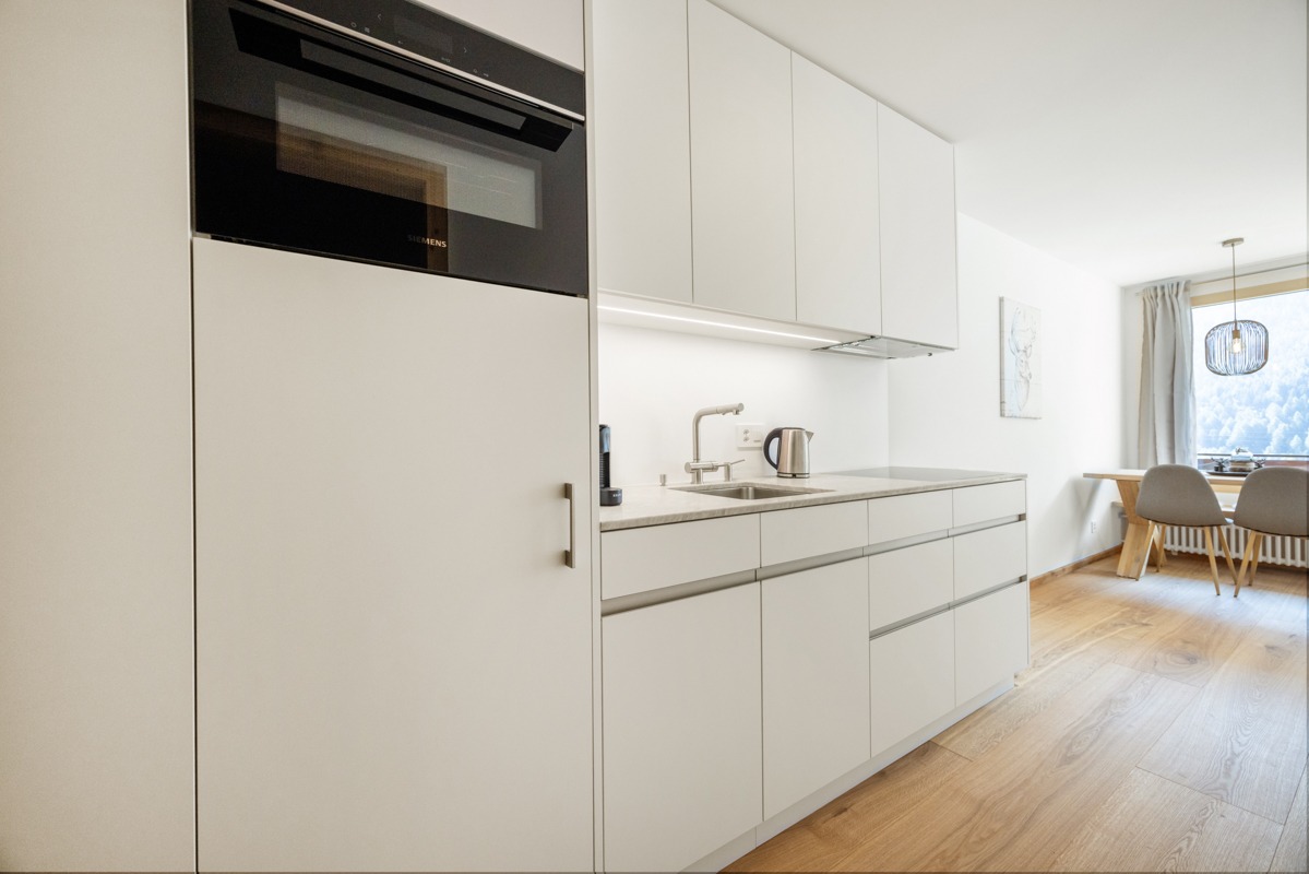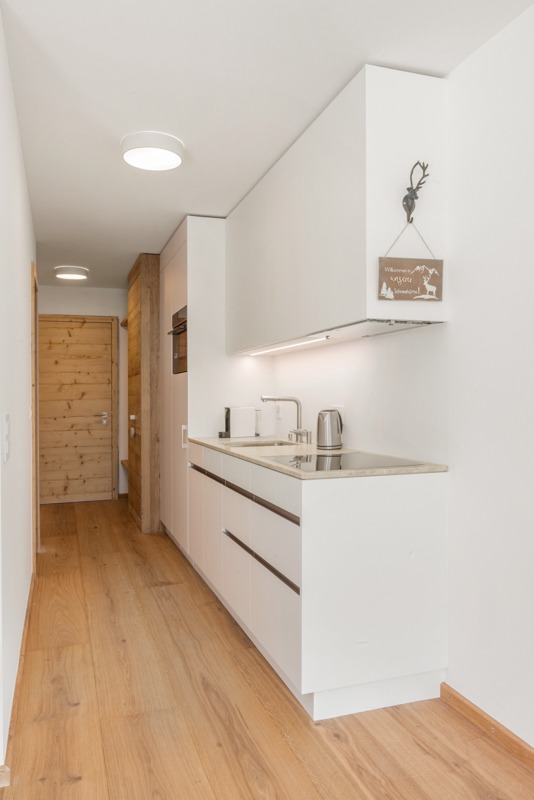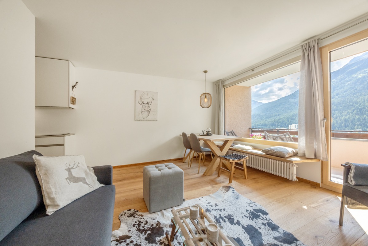 Wir vermieten eine stilvoll möblierte, neu renovierte und hochwertig durchgestylte 2 Zi-Ferienwohnung mit 49m2 BGF und einen Sonnenbalkon Richtung Süden. Die neue Küche mit Kombi Backofen/Steamer und Geschirrspüler ist in einem zeitgemässen Weiss mit italienischer Steinabdeckung gehalten. Die Dusche ist im stilvollen Beige-Weiss gestaltet. Die Fenster, die Elektro- und Wasserleitungen wurden neu ersetzt. Der Eichenholzboden hat 30 cm breite Riemen und ist hochwertig und robust. Das Altholzkonzept für die Türen und Schränke gibt der Wohnung dem alpinen Flair.
